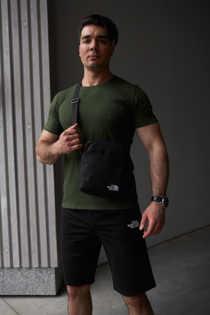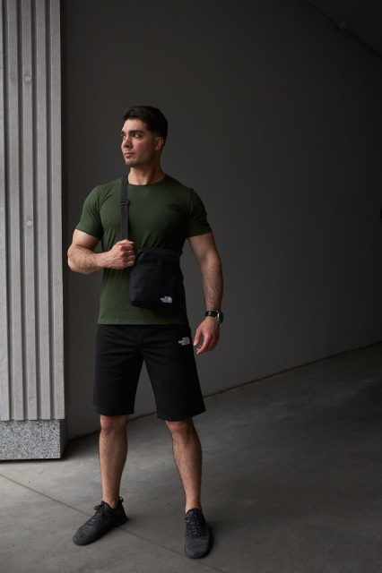 Комплект чоловічий TNF: футболка хакі + шорти чорні + барсетка чорна (9918332981)