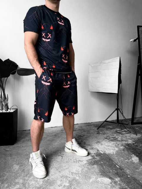 Легкий чорний чоловічий літній спортивний костюм з модним принтом легка футболка та зручні шорти - бездоганний вибір для модників та модниць, що прагнуть до створення стильних та елегантних образів, які будуть доречні як на міських вулицях, так і на пляжних курортах у розпал літа