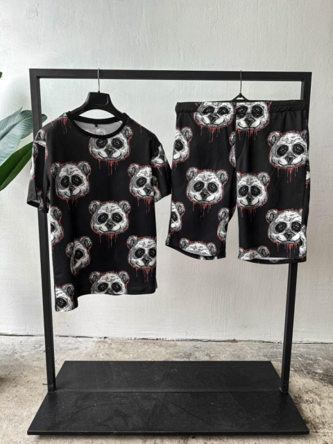 Комфортний чорний чоловічий літній спортивний костюм-двійка з яскравим принтом панди легка футболка та зручні шорти - бездоганний вибір для модників та модниць, що прагнуть до створення стильних та елегантних образів, які будуть доречні як на міських вулицях, так і на пляжних курортах у розпал літа