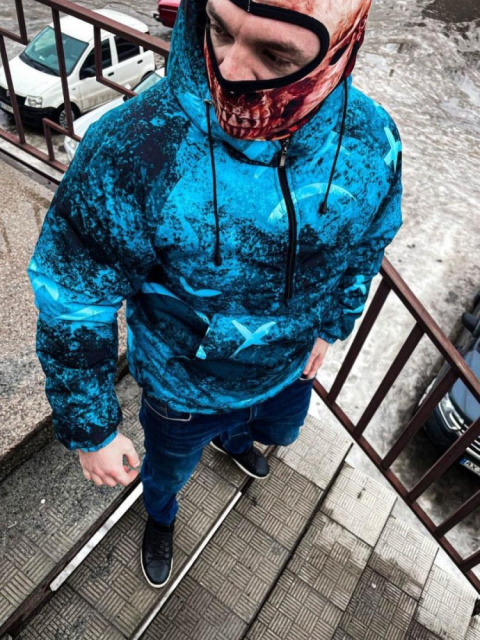 Блакитний теплий чоловічий анорак з принтом ідеальне поєднання сучасного стилю та захисту від холоду, яке підходить для тих, хто цінує комфорт і естетику у своєму зимовому образі