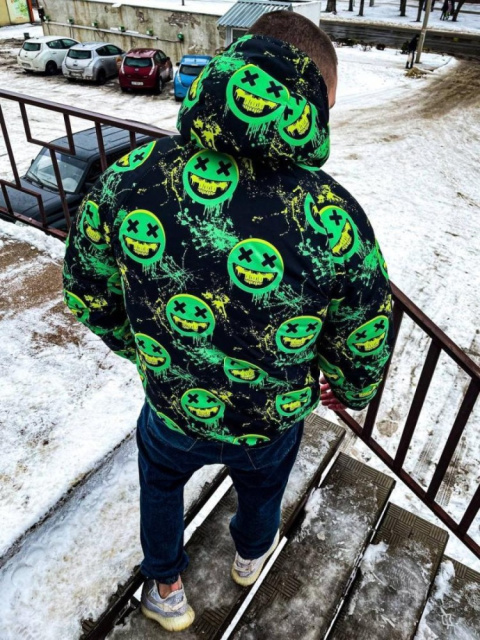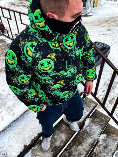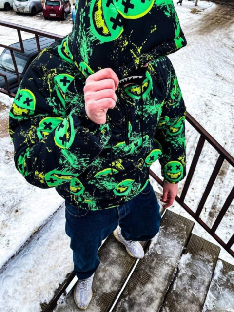 Чорний принтований утеплений анорак з капюшоном ідеальне поєднання сучасного стилю та захисту від холоду, яке підходить для тих, хто цінує комфорт і естетику у своєму зимовому образі