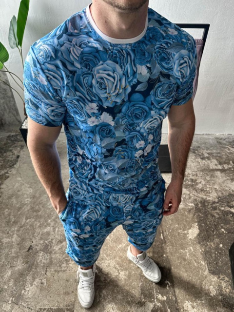 Блакитний чоловічий зручний літній спортивний костюм з яскравим дизайном квітів легка футболка та зручні шорти - бездоганний вибір для модників та модниць, що прагнуть до створення стильних та елегантних образів, які будуть доречні як на міських вулицях, так і на пляжних курортах у розпал літа