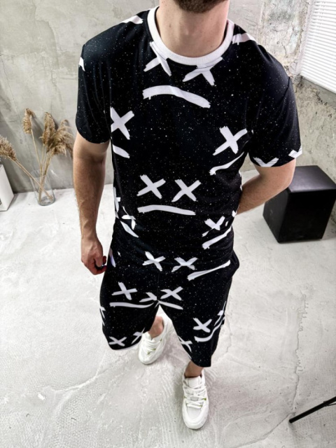 Чорний чоловічий трендовий літній спортивний костюм з яскравим дизайном легка футболка та зручні шорти - бездоганний вибір для модників та модниць, що прагнуть до створення стильних та елегантних образів, які будуть доречні як на міських вулицях, так і на пляжних курортах у розпал літа