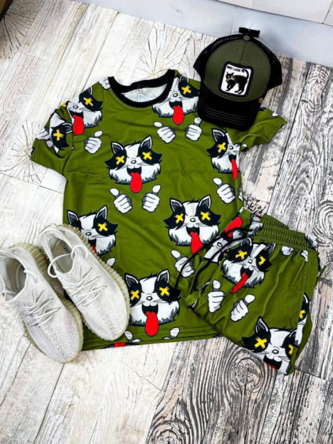Чоловічий принтований костюм з єнотом в кольорі хакі легка футболка та зручні шорти - бездоганний вибір для модників та модниць, що прагнуть до створення стильних та елегантних образів, які будуть доречні як на міських вулицях, так і на пляжних курортах у розпал літа