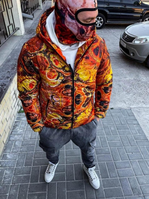 Помаранчева чоловіча куртка з яскравою абстракцією ідеальне поєднання сучасного стилю та захисту від холоду, яке підходить для тих, хто цінує комфорт і естетику у своєму зимовому образі