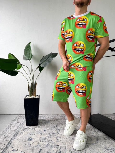 Зелений чоловічий літній легкий спортивний костюм з яскравим принтом легка футболка та зручні шорти - бездоганний вибір для модників та модниць, що прагнуть до створення стильних та елегантних образів, які будуть доречні як на міських вулицях, так і на пляжних курортах у розпал літа