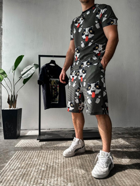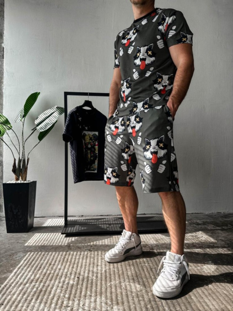 Темно-зелений чоловічий літній легкий спортивний костюм з яскравим принтом легка футболка та зручні шорти - бездоганний вибір для модників та модниць, що прагнуть до створення стильних та елегантних образів, які будуть доречні як на міських вулицях, так і на пляжних курортах у розпал літа
