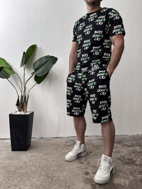Чорний чоловічий трендовий літній спортивний костюм з модними написами легка футболка та зручні шорти - бездоганний вибір для модників та модниць, що прагнуть до створення стильних та елегантних образів, які будуть доречні як на міських вулицях, так і на пляжних курортах у розпал літа