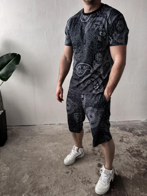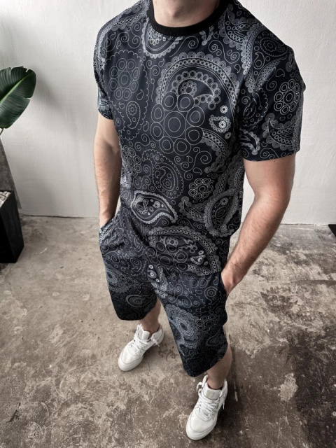 Чорний чоловічий літній стильний спортивний костюм з модним дизайном легка футболка та зручні шорти - бездоганний вибір для модників та модниць, що прагнуть до створення стильних та елегантних образів, які будуть доречні як на міських вулицях, так і на пляжних курортах у розпал літа