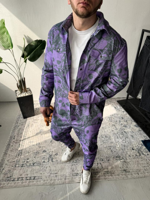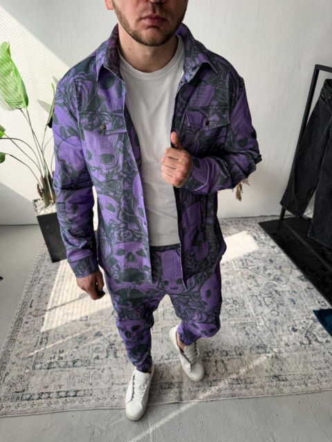 Фіолетовий принтований чоловічий зручний костюм із кишенями стильна сорочка і зручні штани - відмінний вибір для стильного і комфортного образу в спеку!
