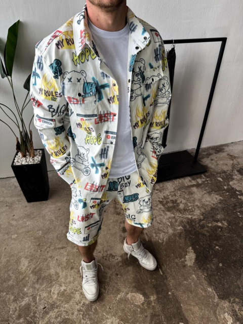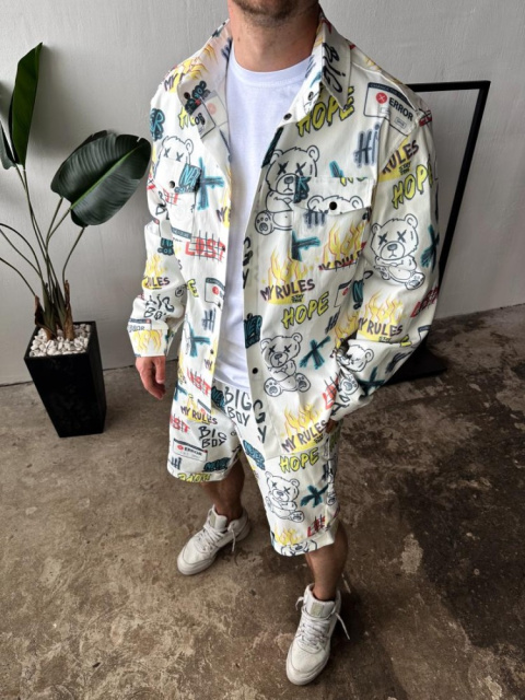 Яскравий чоловічий білий літній костюм-двійка з модним принтом стильна сорочка і зручні шорти - відмінний вибір для стильного і комфортного образу в спеку!