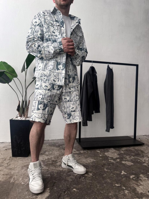 Зручний білий чоловічий літній костюм-двійка з яскравим дизайном стильна сорочка і зручні шорти - відмінний вибір для стильного і комфортного образу в спеку!