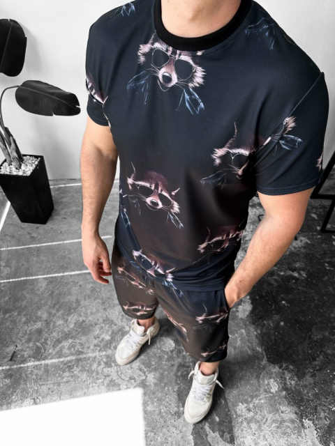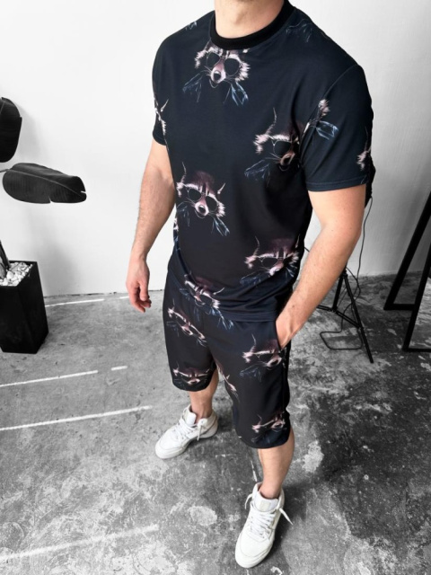 Чорний чоловічий літній легкий спортивний костюм-двійка з модним принтом легка футболка та зручні шорти - бездоганний вибір для модників та модниць, що прагнуть до створення стильних та елегантних образів, які будуть доречні як на міських вулицях, так і на пляжних курортах у розпал літа