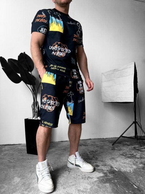 Чорний комфортний чоловічий літній спортивний костюм-двійка з яскравим дизайном легка футболка та зручні шорти - бездоганний вибір для модників та модниць, що прагнуть до створення стильних та елегантних образів, які будуть доречні як на міських вулицях, так і на пляжних курортах у розпал літа