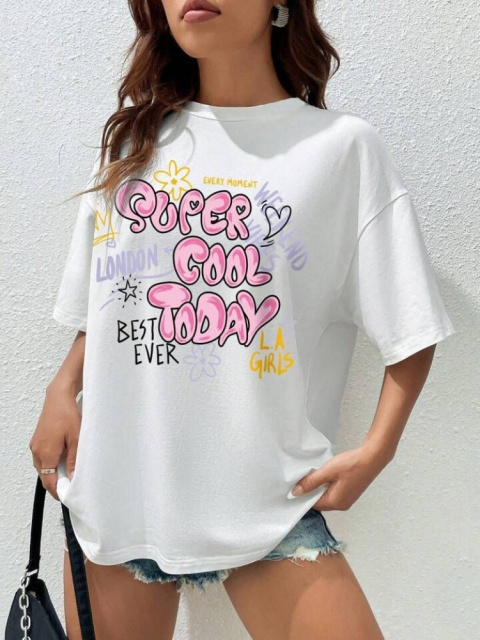 Біла жіноча літня зручна оверсайз футболка з яскравими написами вражаючий союз ультрасучасних модних тенденцій і максимально можливого рівня зручності в дні, що палять