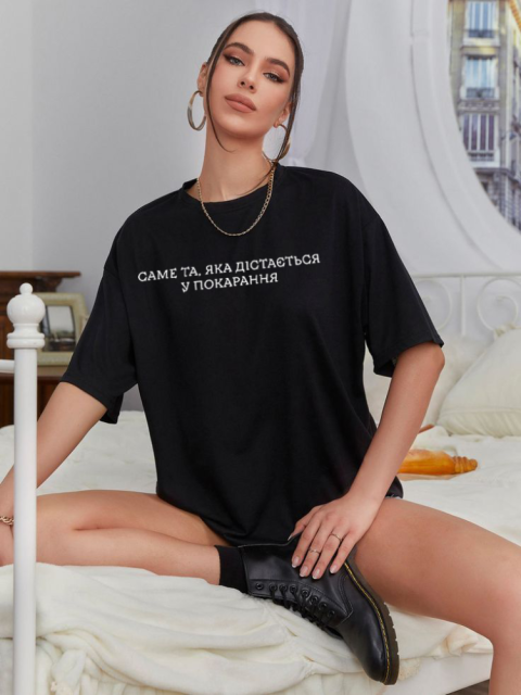 Жіноча чорна модна оверсайз футболка з трендовим принтом вражаючий союз ультрасучасних модних тенденцій і максимально можливого рівня зручності в...