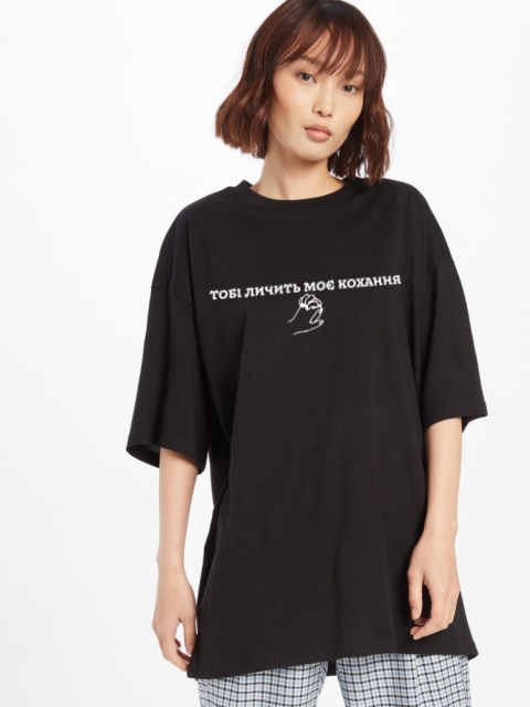 Жіноча чорна модна оверсайз футболка з трендовим принтом вражаючий союз ультрасучасних модних тенденцій і максимально можливого рівня зручності в дні, що палять Характеристики: Матеріал: бавовна Країна виробник: Україна; Колір: Чорний Комплектація: Футболка; Сезон: Літо; Фасон: Стандарт. Розмірна сітка: S Груди: 53 см. Рукав: 23 см. Довжина кофти: 72 см. M Груди: 55 см. Рукав: 25 см. Довжина кофти: 73 см. L Груди: 58 см. Рукав: 25 см. Довжина кофти: 74 см. XL Груди: 60 см. Рукав: 27 см. Довжина кофти: 74 см. XS Груди: 53 см. Рукав: 22 см. Довжина кофти: 68 см.