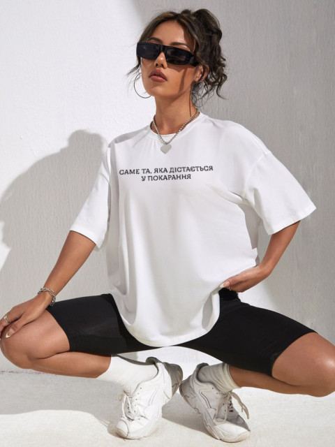 Комфортна жіноча біла оверсайз футболка з модним принтом вражаючий союз ультрасучасних модних тенденцій і максимально можливого рівня зручності в...
