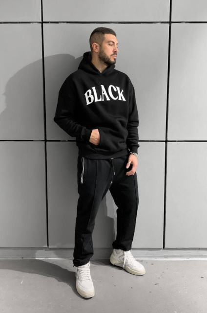 Чорне чоловіче стильне оверсайз худі з модним дизайном унікальне поєднання модних тенденцій та комфорту для сучасних людей, які цінують яскраву...