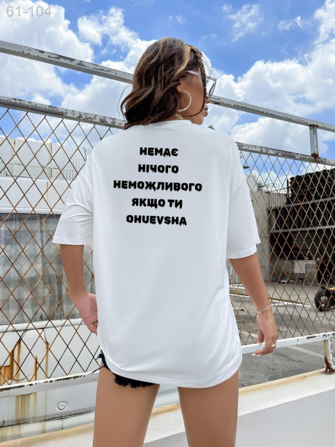 жіноча футболка з мерчем стильна оверсайз розміри літо вражаючий союз ультрасучасних модних тенденцій і максимально можливого рівня зручності в дні, що палять Характеристики: Матеріал: Бавовна Країна виробник: Україна; Колір: Білий Комплектація: Футболка; Сезон: Літо; Фасон: Стандарт. Розмірна сітка: S Груди: 53 см. Рукав: 23 см. Довжина кофти: 72 см. M Груди: 55 см. Рукав: 25 см. Довжина кофти: 73 см. L Груди: 58 см. Рукав: 25 см. Довжина кофти: 74 см. XL Груди: 60 см. Рукав: 27 см. Довжина кофти: 74 см. XS Груди: 53 см. Рукав: 22 см. Довжина кофти: 68 см.
