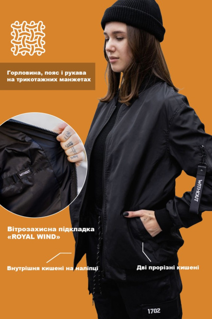Стильний бомбер з яскравою фурнітурою виділить тебе в будь-який тусовці та додасть стилю у твій образ, а надійна вітрозахисна підкладка, яка виготовлена за допомогою технолоігії «ROYAL WIND» захистить тебе від інтенсивного вітру та дощу!