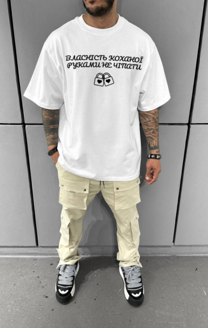 Комфортна біла чоловіча оверсайз футболка з трендовим дизайном вражаючий союз ультрасучасних модних тенденцій і максимально можливого рівня зручності в дні, що палять