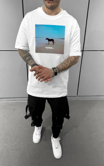 Комфортна біла чоловіча оверсайз футболка з трендовим дизайном вражаючий союз ультрасучасних модних тенденцій і максимально можливого рівня...