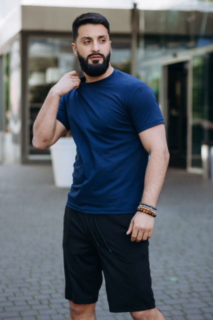 Футболка чоловіча , колір синій . Власне українське виробництво , тканина стрейч -кулір . Склад тканини 95% котон 5% эластан .